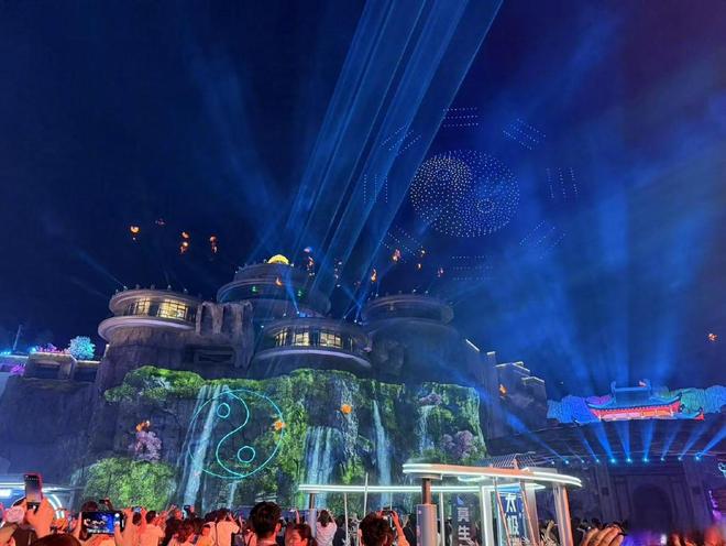 “武当一梦”大型演艺综合体前的灯光秀,不少游客在此打卡拍照。新京报记者 张建林 摄
