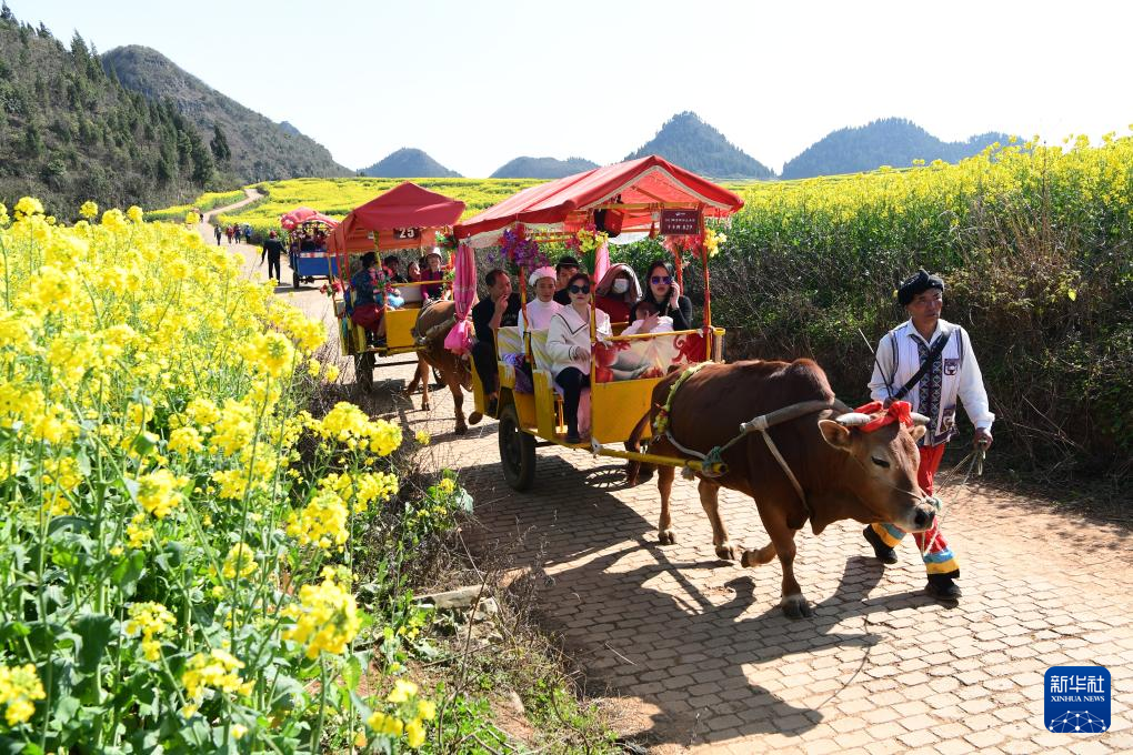 云南省罗平县板桥镇金鸡村村民赶牛车拉游客观赏油菜花(2022年2月28日摄)。新华社发(毛虹摄)
