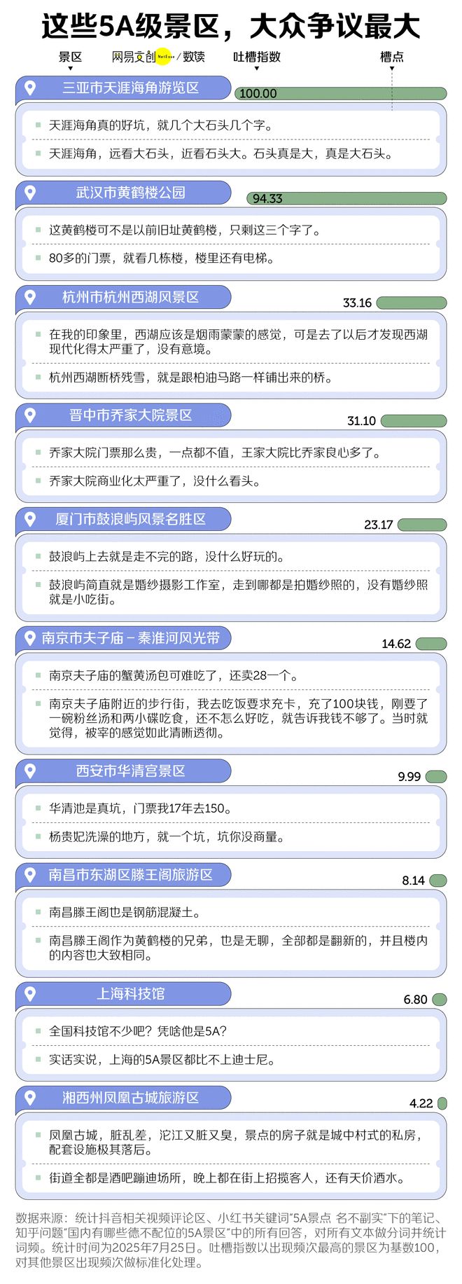 我们统计了社交媒体上最饱受争议的 5A 景区,发现2024年新入选的天涯海角和2007年第一批入选的黄鹤楼两大景区,“断崖式”地承担了最猛的火力。游客们最大的哀叹,当属被欺骗了感情。