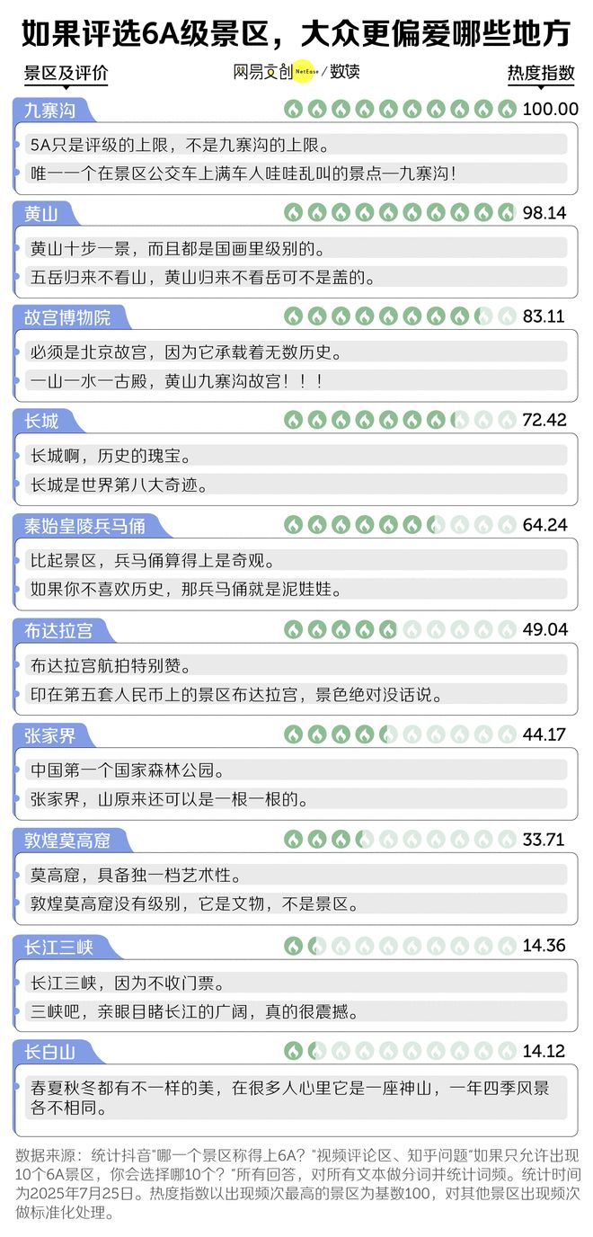 网友提名的 6A 级,人文类景区和自然类景区平分天下。“九寨归来不看水,黄山归来不看岳”的共识,最先进入人们脑海中。紧随其后熊猫体育直播的故宫、长城、兵马俑,也能靠着历史地位牢牢站稳。