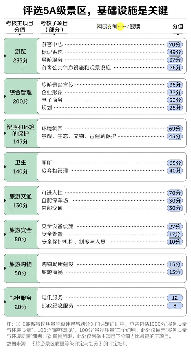 细看这三份细则,倾向显而易见——“景观质量”与“游客意见”总评分加起来只有200分。真正起决定作用的,是“服务质量与环境质量”,满分1000分,5A 景区必须拿到950才能通关。