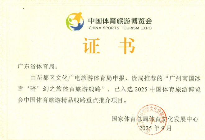 9月12日至14日,2025中国体育文化博览会 中国体育旅游博览会(以下简称“两个博览会”)在苏州国际博览中心举行。花都区申报的“广州南国冰雪‘骑’幻之旅”入选2025年中国体育旅游精品线路,是本次博览会重点推介的十个体育旅游精品线路之一