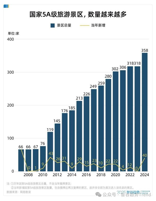 最新数据显示,全国5A级旅游景区数量已从2007年首批的66家,增长至如今的358家。仅仅在2024年,就新增了40家5A景区,增速高达12.6%,创下近十年来的新高。然而,与数量上“遍地开花”形成鲜明对比的是,不少拥有5A招牌的景区经营状况并不理想。披露经营数据的十余家景区类上市公司中,超过半数出现业绩下滑。一边是“金字招牌”的持续扩容,一边是部分景区客源流失与口碑争议,这种反差引发了许多人的思考:5A景区这块招牌的含金量,究竟还剩多少?