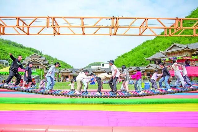 10月6日,游客在三穗县八弓镇贵洞景区参加趣味“网红桥”,感受国庆假期欢乐。 (通讯员 邹光学 摄)