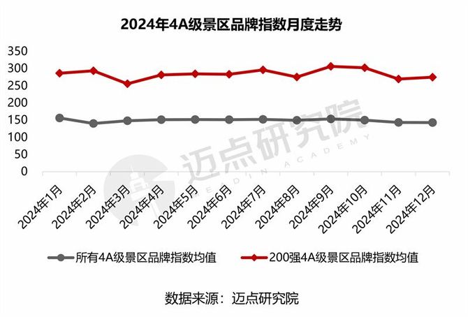 2024年所有4A级景区品牌指数均值为149.23,200强4A级景区品牌指数均值为284.25。从月度走势来看,200强4A级景区品牌指数呈波动态势,其中3月处于旅游淡季,叠加春节刚过等因素影响,品牌指数下滑明显;9月和10月,在中秋节和国庆节的带动下,品牌指数回升明显。