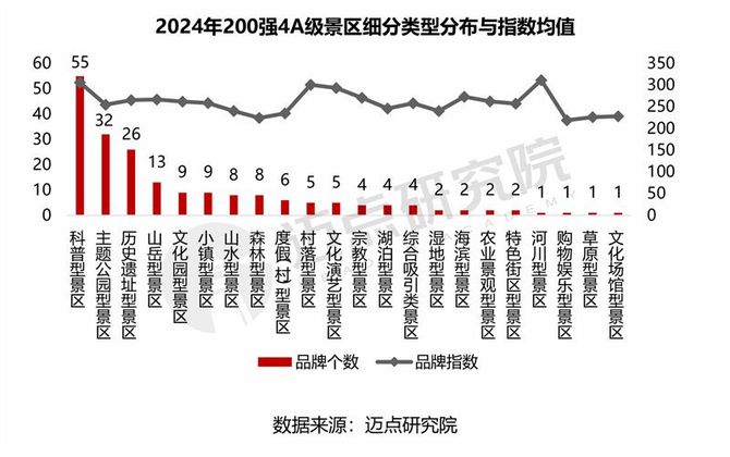 从2024年200强4A级景区类型分布来看,人文景观类景区个数和指数表现为“双高”,其中品牌个数占比达55%;乡村田园类景区个数虽少(7个),但其指数最高,为289.8,7个上榜景区分别为:西江千户苗寨、肇兴侗寨、上海浦江郊野公园景区、云南民族村、景迈山茶林文化景区、城区司徒小镇景区、沂南竹泉村旅游区;其余类型景区指数相对较低,其中现代娱乐类和自然景观类景区个数分别为41个、39个,综合吸引类景区有4个。