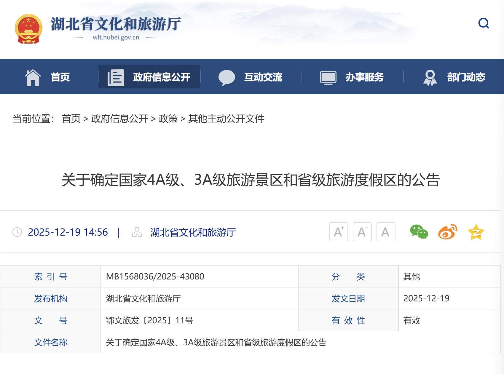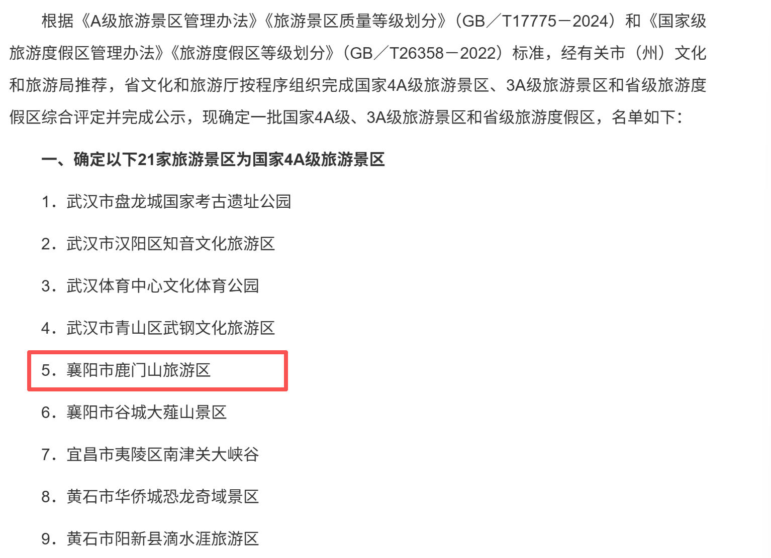 近日,根据《旅游景区质量等级的划分与评定》(GB/T 17775-2024)和《旅游景区质量等级管理办法》,经市(州)文化和旅游局初评推荐,湖北省文化和旅游厅组织评定:襄阳鹿门山景区达到国家4A级旅游景区标准,正式晋升为国家4A级旅游景区。