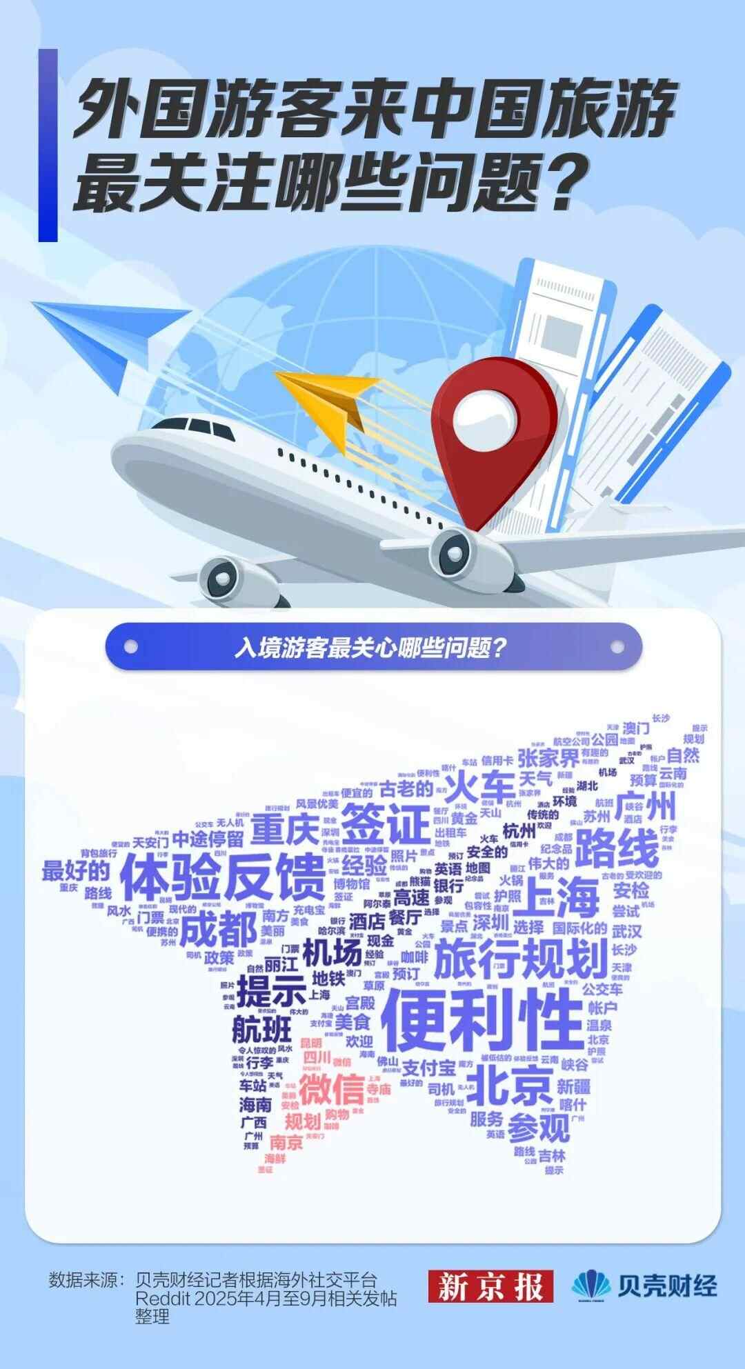 这些涌入中国的外国游客有着哪些真实的期待与顾虑?新京报贝壳财经记者梳理了近几个月海外社交媒体平台上1212条关于中国旅行的帖子,发现除北京、上海等传统热门城市外,越来越多人正寻求九寨沟、张家界、丽江、阳朔、桂林等地的旅游攻略;而在考虑是否来中国旅行时,交通、网络、电话卡、支付便利性等问题都是外国游客关注的焦点。