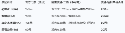 还是以甘孜州游客必去的两个核心景区为例,稻城亚丁,一张门票价格大约是150元,但是,如果游客想真正走进景区深处看到神山,120元观光大巴和80元电瓶车是躲不开的刚需。