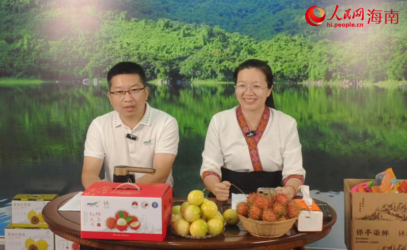 中国海油乡村振兴挂职干部、保亭黎族苗族自治县副县长杨涛(左)在直播中推介优质特色农产品。人民网记者 毛雷摄