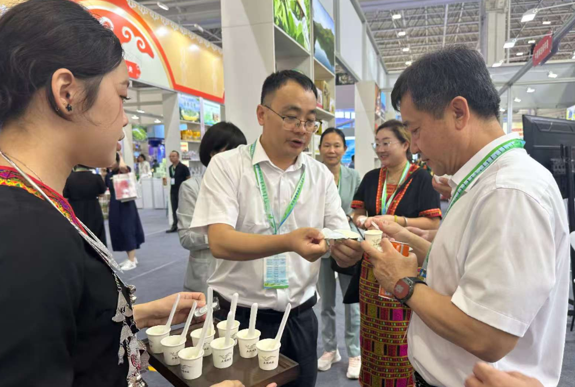 中国海油乡村振兴挂职干部、五指山市副市长李晓涛(中)参加消费帮扶活动的照片,推广五指山红茶。受访者供图