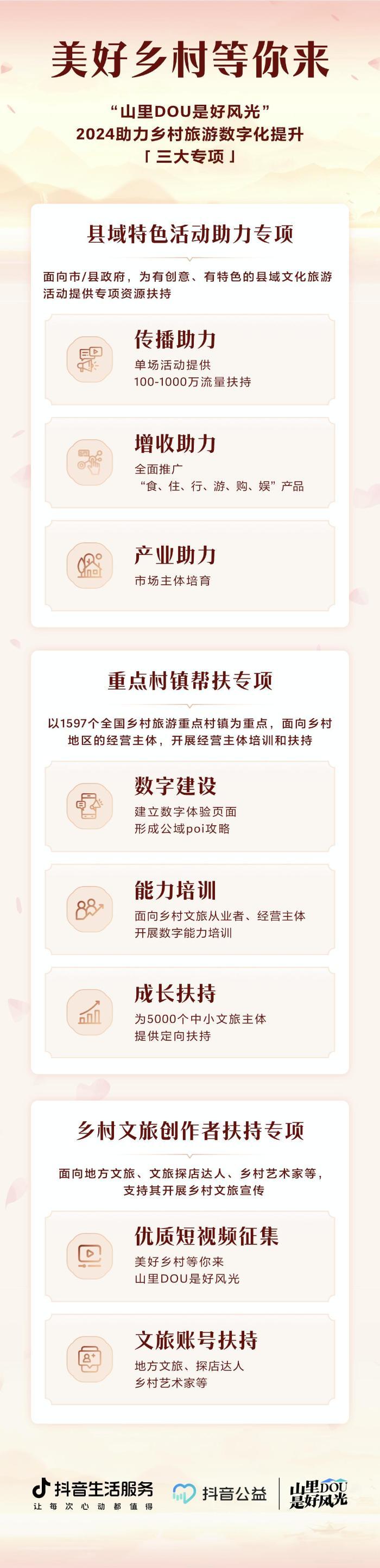 二是“重点村镇帮扶专项”。活动将以1597个全国乡村旅游重点村镇为核心,面向乡村地区的经营主体开展帮扶。包括建立抖音专属的乡村数字体验poi(地理位置)、页面和游玩攻略;面向乡村文旅从业者、市场经营主体的数字能力培训;面向5000个中小文旅经营主体的定向扶持。