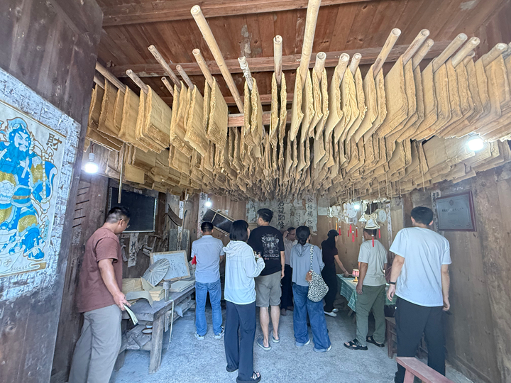 马头村的“党建+网格+积分”治理模式同样引人关注。同学们走访了葡萄种植基地,了解产业与村集体经济的联结机制。陇脚村则以古法造纸非物质文化遗产为核心,推动文旅融合。同学们在传统造纸作坊中了解制作过程,与非物质文化遗产代表性传承人深入交流,了解文化如何转化为产业动能。“一张纸,承载的不仅是技艺,更是一方水土的文化记忆。”非物质文化遗产代表性传承人胡忠亮动情地说道,我们要做的是传承和守护好这份珍贵的文脉。