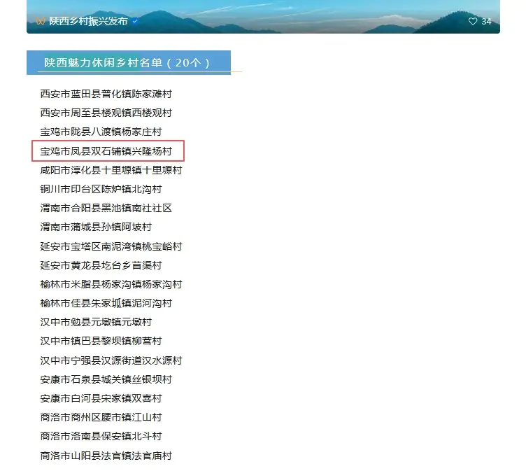 9月17日,陕西省农业农村厅正式发布第二届陕西魅力休闲乡村和陕西特色魅力田园推介名单,全省20个乡村和15个田园景观入选,凤县兴隆场村入选陕西魅力休闲乡村名单。
