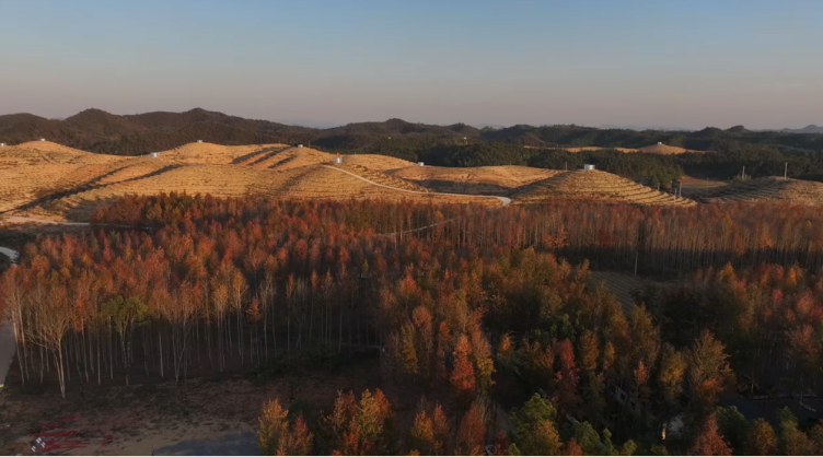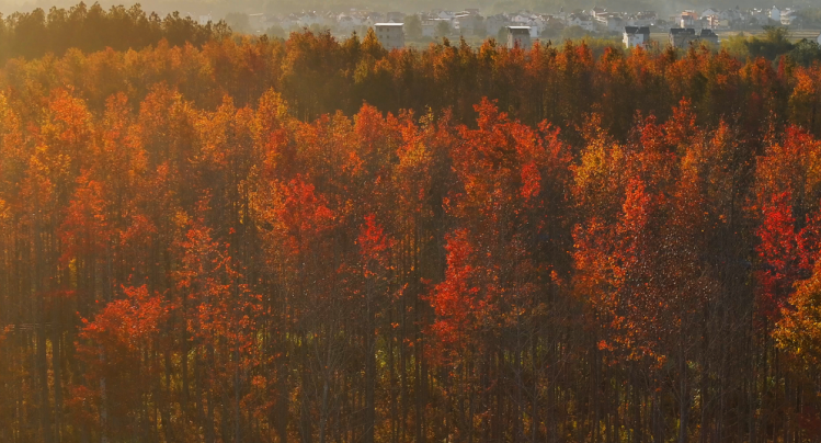 皖赣毗邻,山水相依。时值暮秋初冬,位于两省交界处的东至县龙泉镇古楼村枫林牧场,正褪去浅秋的温婉,悄然换上一年中最炽烈的盛装。