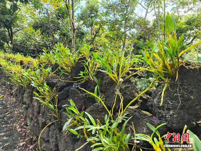 在海口市石山镇施茶村,黝黑嶙峋的火山岩缝间,一簇簇石斛青翠欲滴,生机盎然。 中新网记者 张茜翼 摄