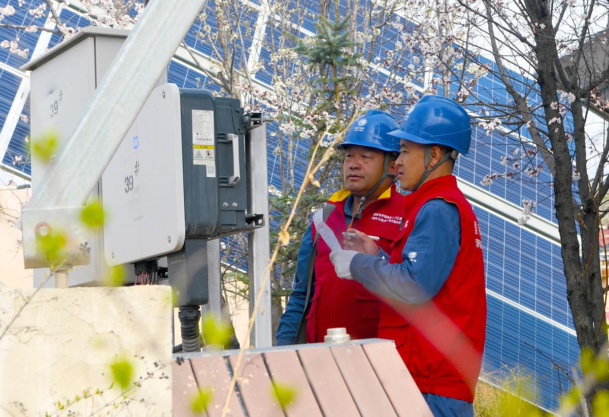 国网海东供电公司五十供电所员工在班彦新村开展安全用电大检查,对村中的光伏电站设备进行隐患排查。李永鹏摄