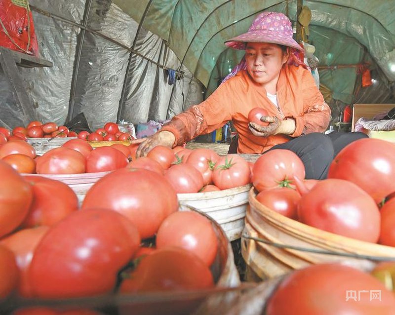 种植户张义祥和老伴一早便忙着采摘成熟果实。他告诉记者,今年种植的是金鹏品种,全程采用生态种植模式,果实皮薄肉厚、甜度适口,一上市就备受青睐。“现在每天能采摘1000多斤,忙得脚不沾地,但看着满棚红彤彤的番茄,心里比蜜还甜。”张义祥笑着说。待番茄采摘结束后,他将轮作茄子、辣椒等应季蔬菜,实现大棚四季有产出、全年有收益。